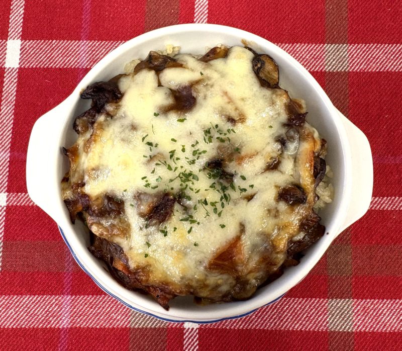 寒い日にうれしい「ビーフシチュードリア」、牛薄切り肉で手軽に作るビーフシチューの下には、炊飯器でつくるガーリックライス!これが美味しさの秘密のひとつです。