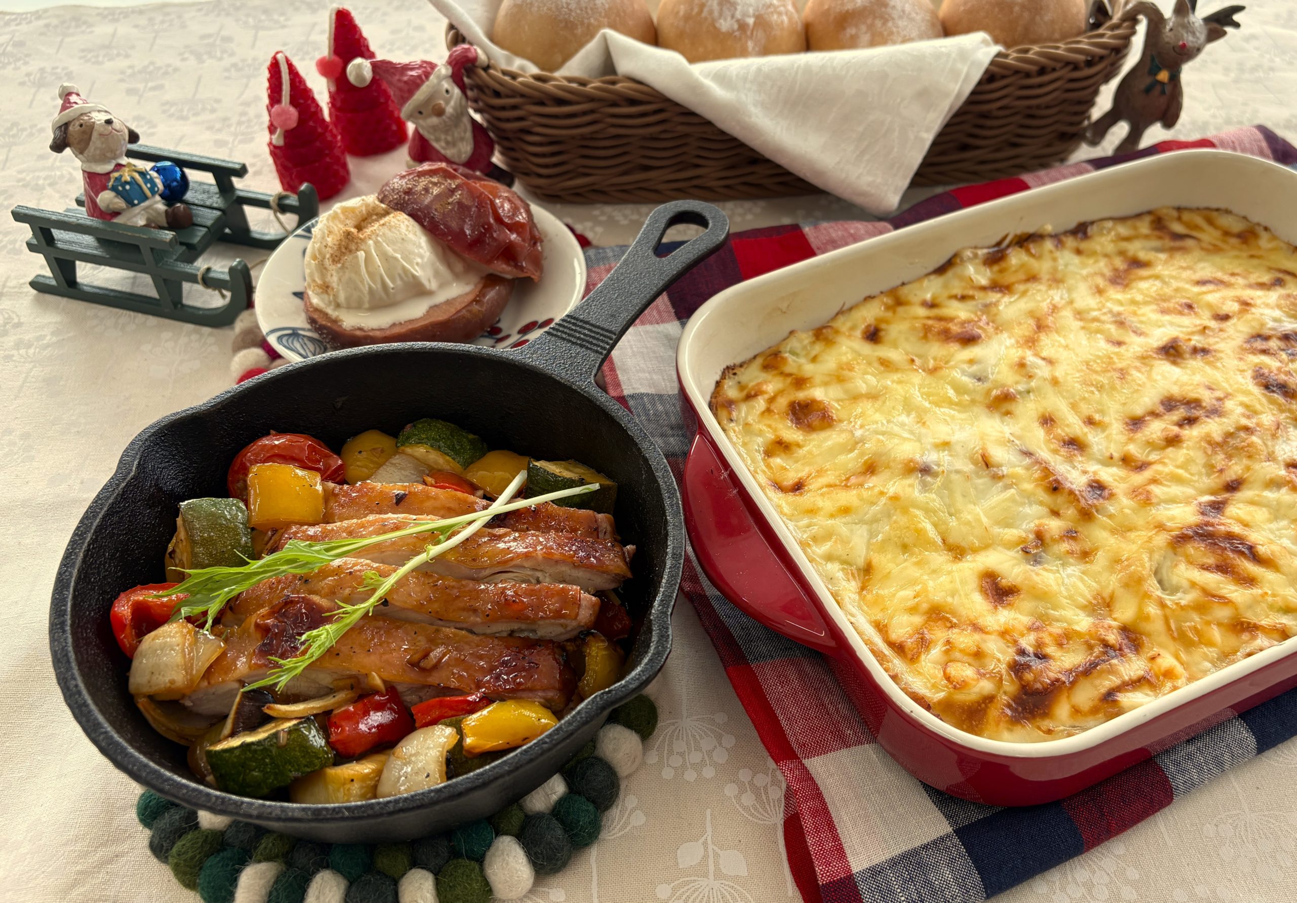 鶏モモ肉とカラフル野菜をバルサミコ酢等に浸けて「バルサミコチキン」、「ポテトグラタン」は、たっぷり作ってシェアしていただきます。そしてデザートは「焼きりんご~バニラアイス添え」はシンプルで何度も食べたくなる冬のスイーツ。お好きなドリンクをお持ちください。