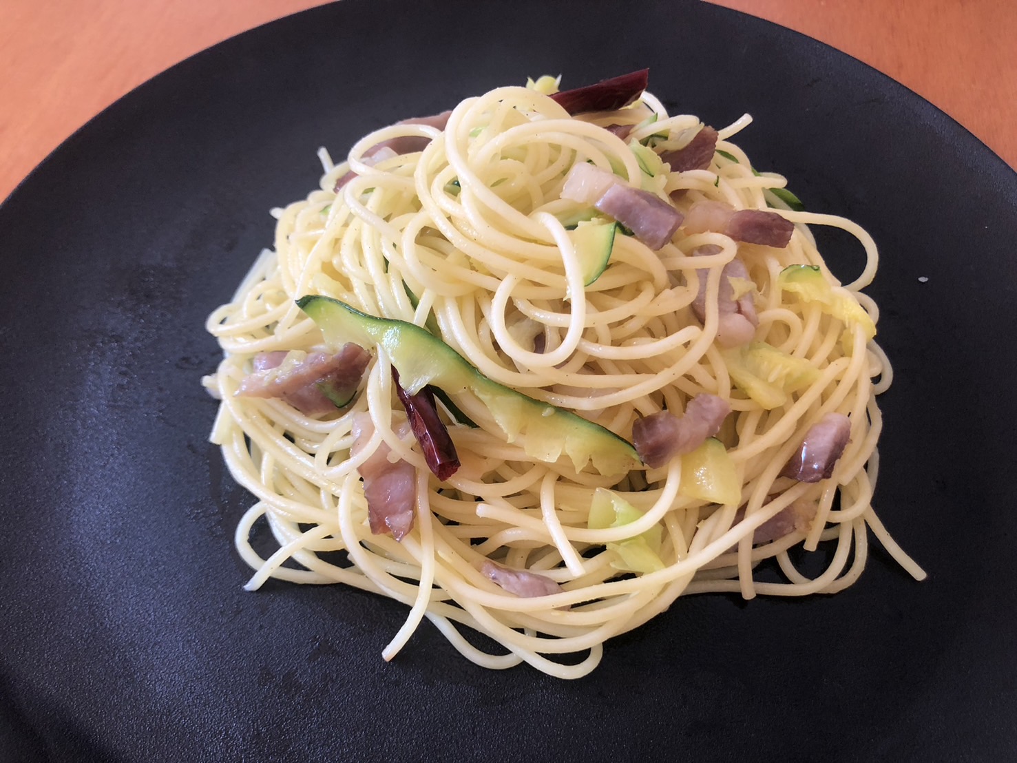 1週間熟成して「自家製パンチェッタ」を作ります。ペペロンチーノは、にんにくの香りをパンチェッタやズッキーニ、パスタに移して仕上げます。アメリカ発祥のカラフルなコブサラダを作ります。